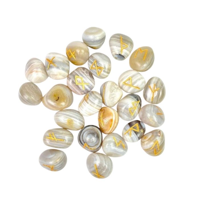 • A full set of 24 Elder Futhark runes carved from natural banded agate