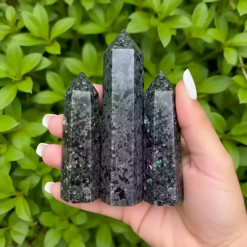 Note: Each Larvakite tower is unique, with natural iridescent patterns and variations in size and shape.