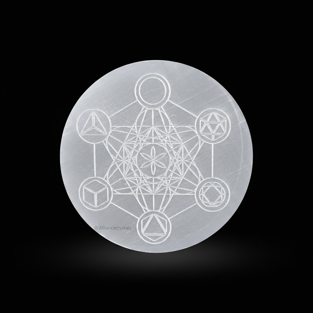 If you are searching for a Metatron (Platonic Solid) selenite crystal charging plate, this sacred tool is the perfect choice for cleansing and amplifying your crystal collection. Hand-carved from pure selenite, this plate is engraved with the powerful Metatron’s Cube design – a symbol of sacred geometry that holds all five Platonic Solids.