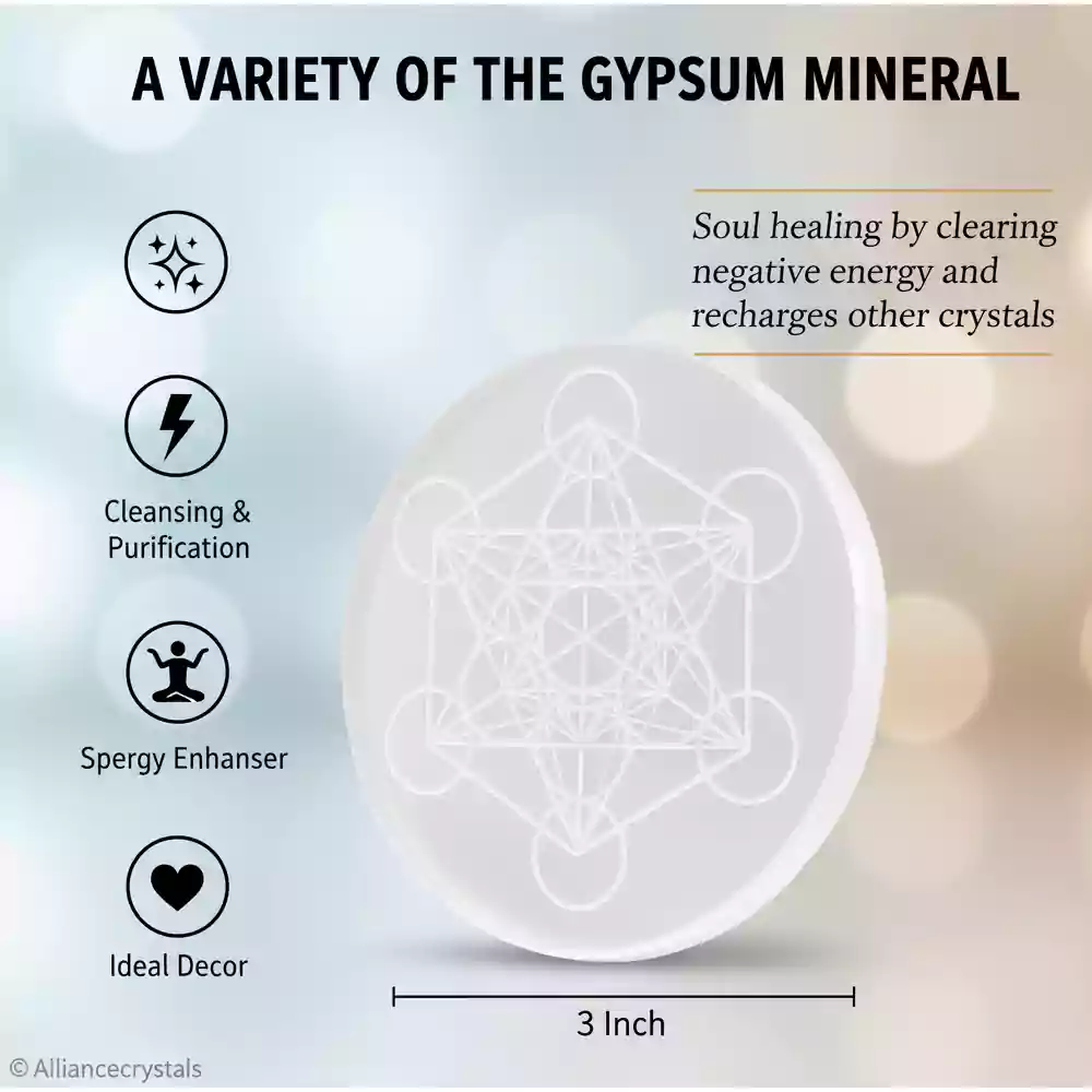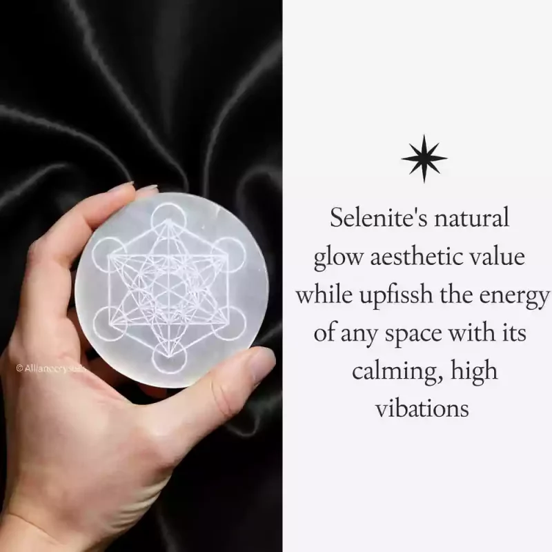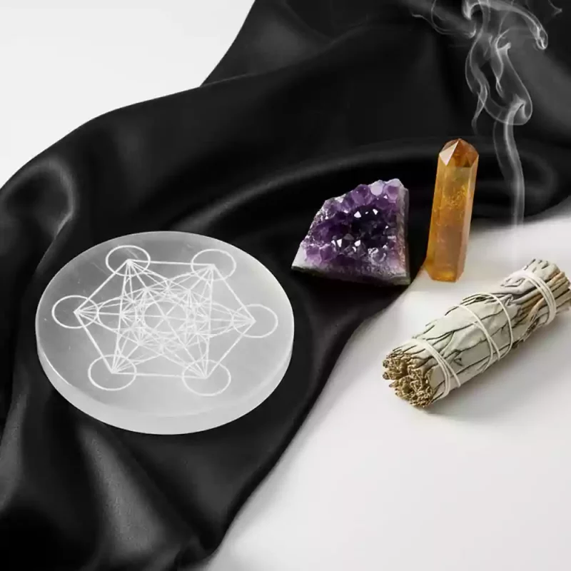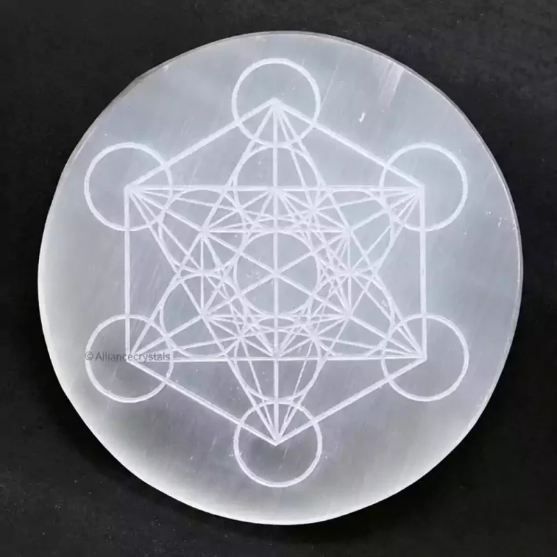 Unlock the divine power of sacred geometry with our Metatron of Life Selenite Crystal Charging Plate. This beautifully carved selenite charging plate for crystals is designed to cleanse, charge, and amplify the energy of your gemstones, jewelry, and spiritual tools.
