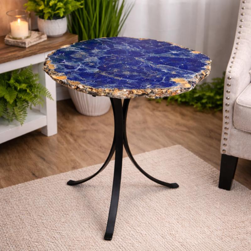 This stunning accent table features a unique round slice of genuine lapis lazuli, showcasing its natural deep blue hues and golden pyrite inclusions. Its organic, live edge design is complemented by a sleek, modern black metal base, making it a captivating statement piece for any room.