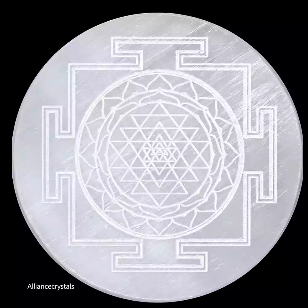 Elevate your spiritual journey with our Sri Yantra Selenite Crystal Charging Plate. Designed with the ancient Sri Yantra symbol, this sacred selenite charging plate for crystals cleanses, recharges, and amplifies the energy of your gemstones.